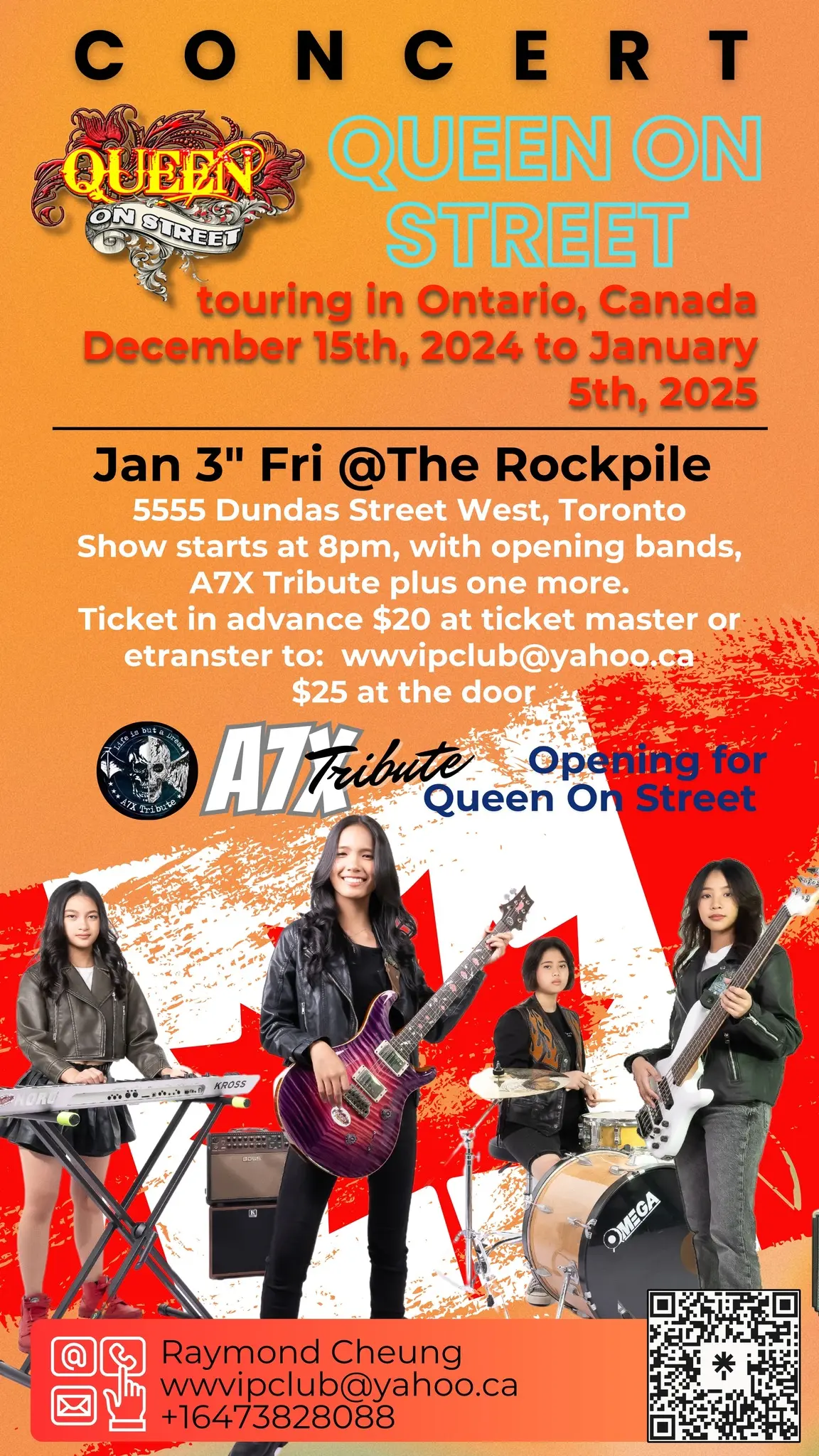 03 Jan 2025 Ontario, Canada The Rockpile 5555 Dundas St. West, Toronto Info Show Starts 8 p.m. Ticket $20 (in advance) / $25 Opening Bands A7X Tribute, Meteor Girls and Hogtown Rebels